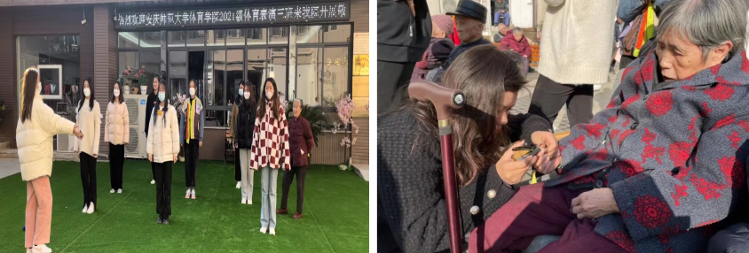 除了聊家常,学生还为老人们表演了精心编排的舞蹈,与老人们一起合唱 “天仙配”、“我和我的祖国”等歌曲,风趣的表演让老人们合不拢嘴,整个敬老院充满欢声笑语、掌声不断。“看到老人们脸上洋溢的笑容,听到老人们爽朗的笑声,我们充分体会到了本次活动的意义所在。” 2021级体表3班团支书王莹说道:“希望我们的到来能够让老人们在精神上能够老有所依、老有所乐”