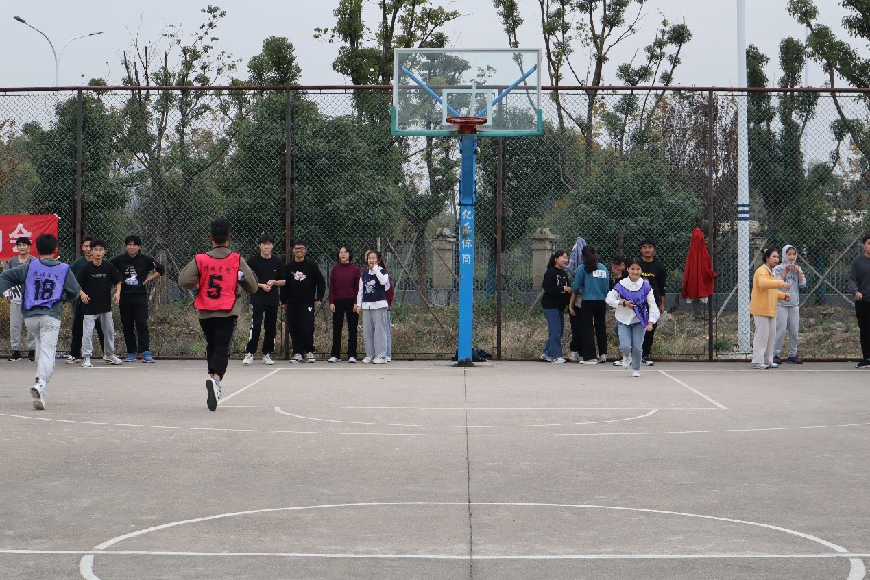 “跳绳接龙”要求每队两人摇绳,其余八人依次加入跳绳,统计90秒内每队跳绳次数。“让气球活下来”环节中,参赛选手左右脚各绑一个气球,在指定区域内活动,保护气球不被踩爆。“背人投篮”需要各队伍派出两人参赛,一人蒙眼,将另一人背起向球筐移动,背上人则需要在指定位置投篮。“十人十一足”各班派出十名选手,两两将腿绑在一起向前走,考验班级学生的默契和配合。选手们的精彩表现点燃了现场围观学生们的热情,他们纷纷为自己班级的参赛选手呐喊助威,并拍照记录精彩瞬间。