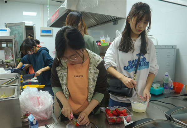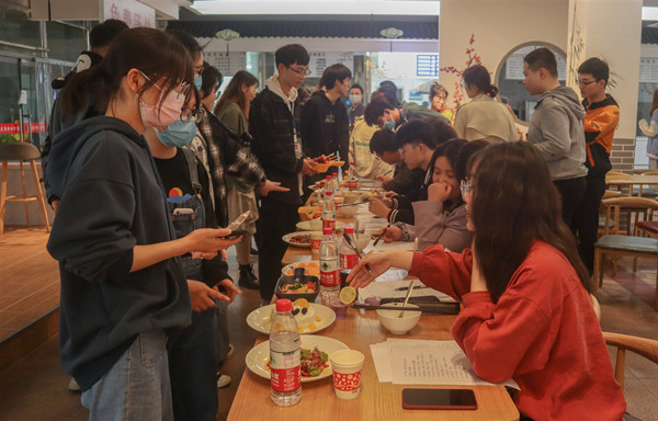 各类菜式争奇斗艳,使得围观者啧啧称奇。有从中式厨房里送出的西式甜点——“芋”见,是由芋泥、酸奶、吐司片等食材制作而成的健康低脂餐;有制作工艺复杂的黑椒香橙鸡翅,从腌制到出菜,耗时近半个小时;有名称寓意美好的佳肴——四喜福袋,饺子皮做袋儿,玉米虾仁豌豆胡萝卜做馅儿;更有水果拼盘做成几尾红金鱼的模样,栩栩如生,惹人喜爱,连食堂阿姨都忍不住拿出手机拍张照片。