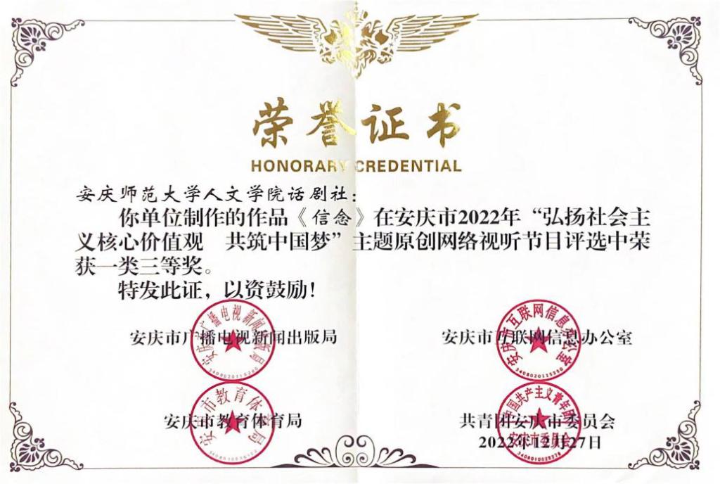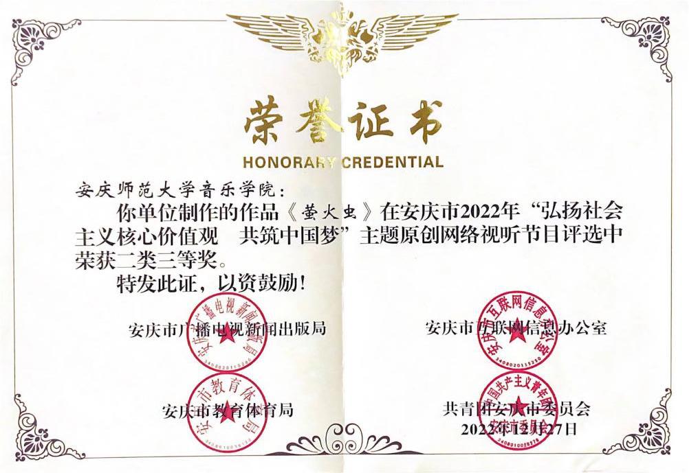日前,由安庆市广播电视新闻出版局、安庆市互联网信息办公室、安庆市教育体育局、共青团安庆市委员会联合开展的安庆市2022年“弘扬社会主义核心价值观 共筑中国梦”主题原创网络视听节目活动获奖结果揭晓。威尼斯官网音乐学院原创作品《萤火虫》获得二类三等奖,人文学院话剧社原创作品《信念》获得一类三等奖。