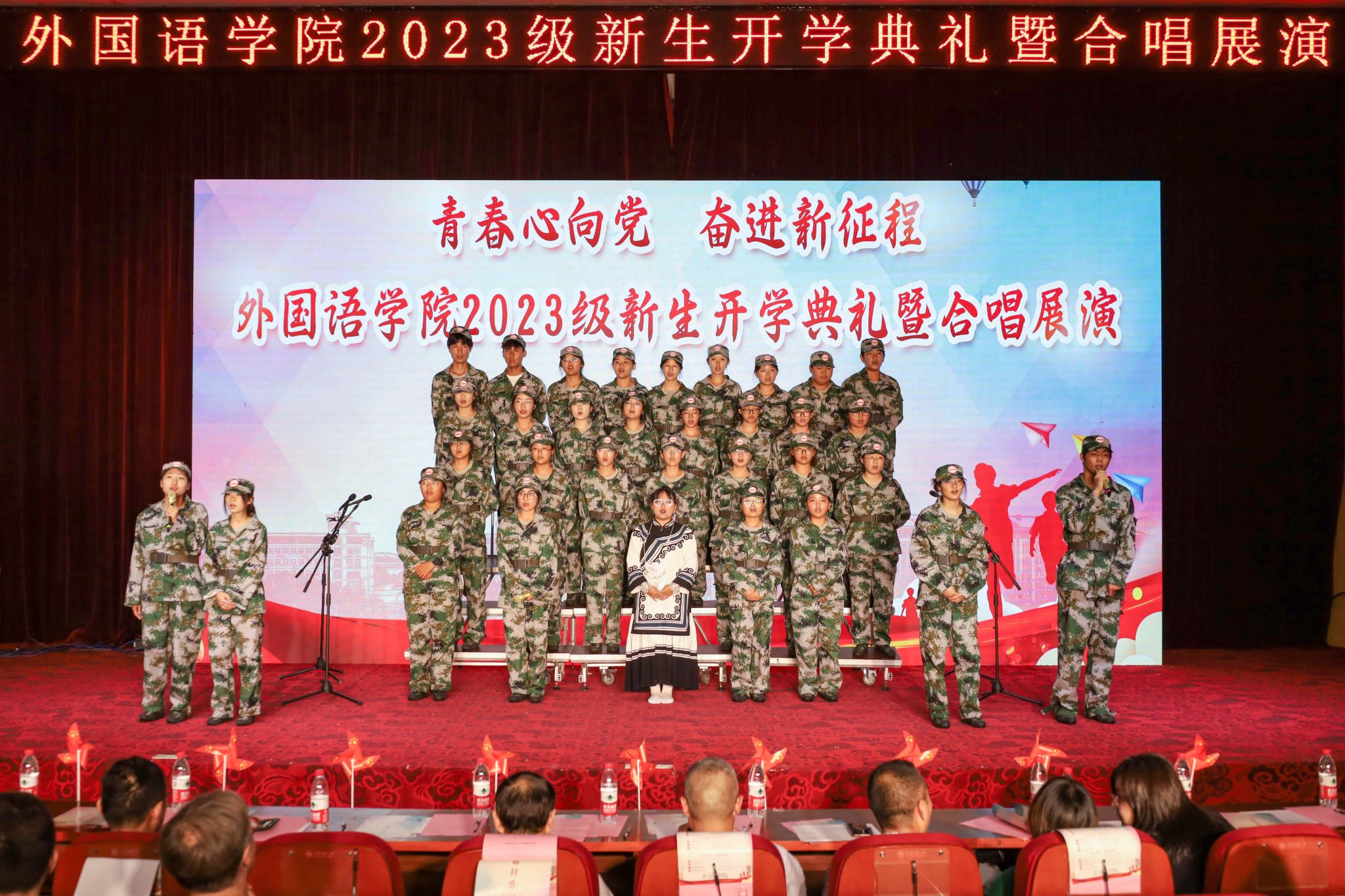 开学典礼之后,新生合唱展演分为青春正当时、逐梦新时代、奋进新征程三个篇章进行。《在阳光灿烂下》《有我》《我和我的祖国》等12首经典歌曲悉数搬上舞台。双语朗诵,配合手势舞蹈,外国语言类专业2023级(2)班用真挚的情感和动人的曲调合唱《最美的太阳》,收获观众的一致好评;身着彝族服饰,佩戴彝族饰品,外国语言文学类专业2023级(4)班合唱《等你下课》,引起观众的青春回忆;手持星星灯,创意结合古筝弹奏,外国语言文学类专业2023级(3)班以《星辰大海》表达少年人的积极进取;脸上贴着国旗,振臂高呼“振兴中华”,外国语言类专业2023级(10)班花样演绎《我和我的祖国》,表达对祖国的深爱与眷恋。