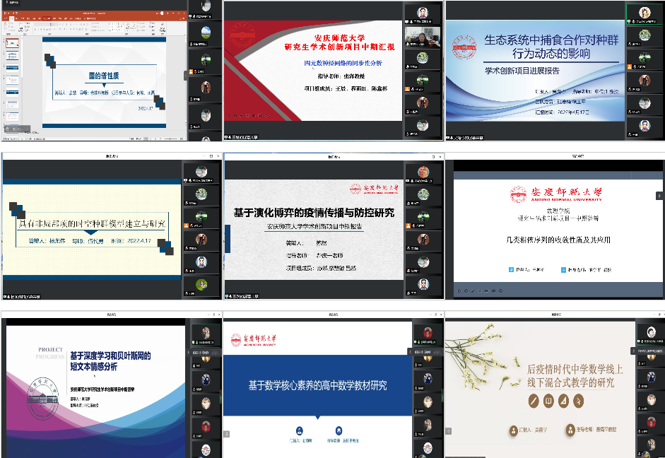 4月17日,数理学院顺利完成了2021年度研究生学术创新项目中期检查线上答辩工作。参加本次学院中期检查答辩的有11项课题,其中省级1项、校级1项、院级9项。余桂东教授、张海教授、胡学平教授、郝庆一教授、伍代勇教授、叶仁玉教授、殷周平教授等分别参加两个答辩专家组和100余名在读研究生参加线上答辩会,两个答辩组分别由张海和胡学平主持。