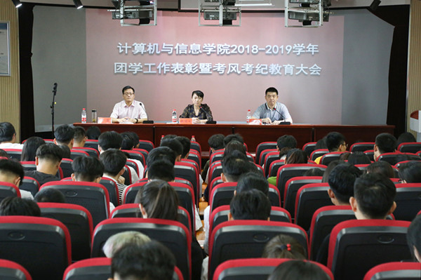 6月24日,计算机与信息学院2018-2019学年团学工作表彰暨考风考纪教育大会在F411教室举办,学院党委书记陈银凤、党委副书记江伟、副院长刘奎、全体辅导员以及各学生干部代表参了大会。