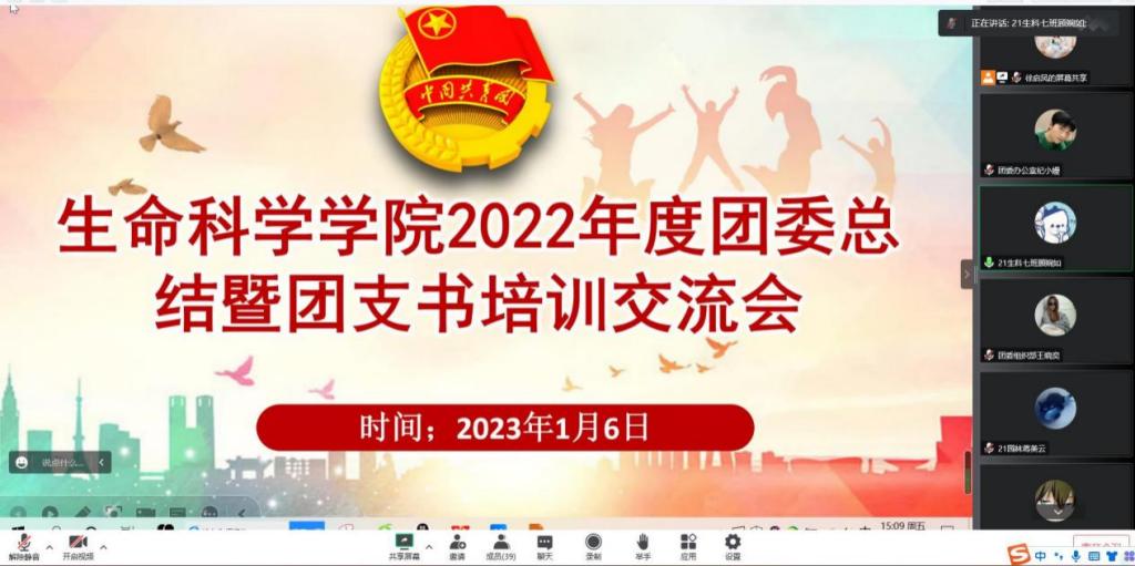 1月6日,生命科学学院于线上召开2022年度团委总结暨团支书培训交流会,进一步加强基层团组织建设,提升团干部理论水平和业务能力。院团委全体成员、各班级团支书参加此次会议。
