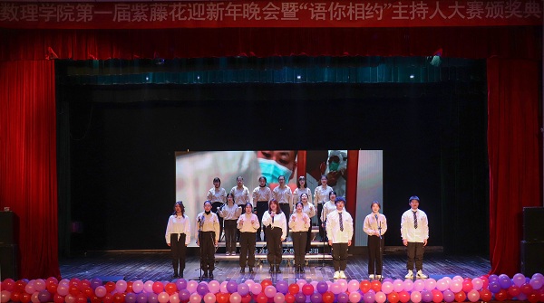 12月16日,数理学院在龙山校区音乐厅举办第一届紫藤花新年晚会暨“语”你相约颁奖典礼。学院党委书记钟金标、副院长张海、党委副书记何骏以及来自各学院的辅导员代表们与现场400余名学生共同观看了此次晚会。晚会同时在易班和抖音进行同步直播。