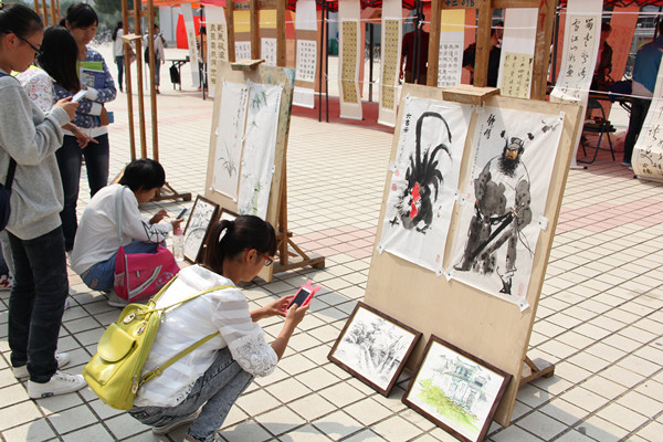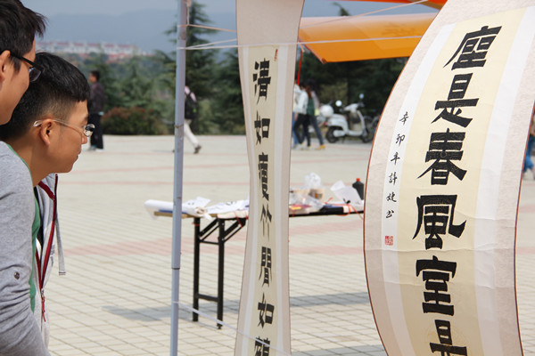 各位亲们,10月9日在教学楼广场上,你们看到摆放的精美书画了吗?书画里面有你的作品吗?这是“醉墨秋香”大型书画展,现场一幅幅书画作品,吸引着众多过往的同学们驻足观看。
