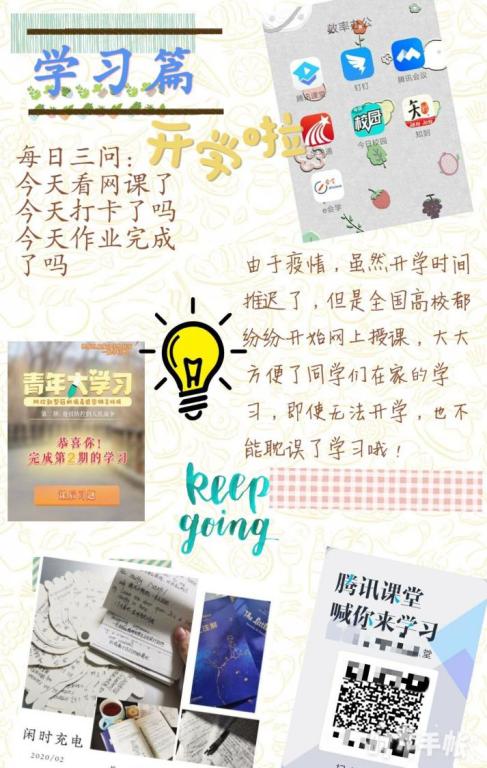 防疫日记由加油篇、美食篇和学习篇三个章节组成。加油篇中,外国语学院学生用自制文案和画作,聚焦社会热点,记录下勠力同心战“疫”过程中的诸多暖心瞬间,再现一线人员的冲锋陷阵、普通民众的守望相助。美食篇中,学院学生纷纷晒出自己居家所做的美食,分享诸如“第一次做蛋糕”“又一位大厨出道”“拉近了与父母的距离”的烹饪心得,以独特的方式展现面对疫情的生活态度。学习篇则立足高校正在开展的网络授课,鼓励学生积极投入到各课程的线上学习中,踊跃进行课上互动,自觉完成线上作业,利用优质的学习渠道进行“自我充电”。