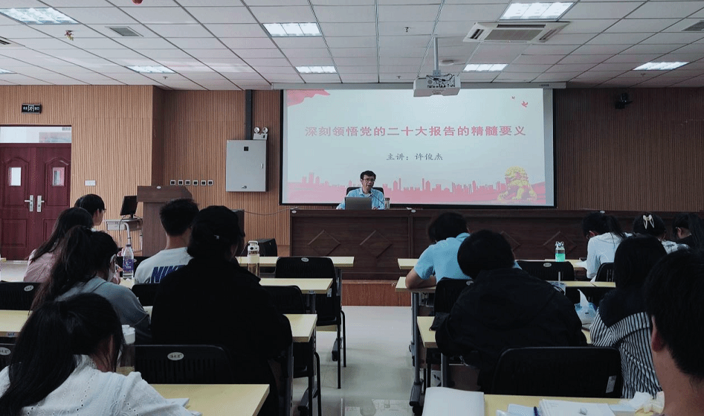 4月19日,经济与管理学院举办党的二十大精神宣讲会,学院党委书记许俊杰做专题辅导报告,学院第67期党课培训班全体学员聆听宣讲报告。