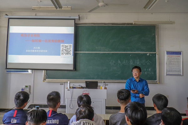 刘奎向在场的观众介绍了本次报告会的主讲人冯士海,并代表学校对优秀校友的到来,表示热烈欢迎和衷心感谢。同时希望同学们认真汲取优秀校友的宝贵经验,树立远大目标、提升学习能力,努力实现自己的人生价值。