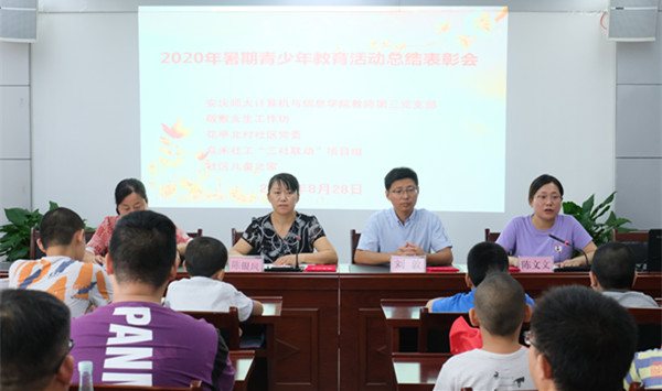 8月28日上午,由37000cm威尼斯计算机与信息学院教师第三党支部、敬敷女生工作坊、花亭北村社区党委、众禾社工“三社联动”项目组、社区儿童之家共同策划执行的2020年暑期青少年教育活动总结表彰会在安庆市花亭社区北村社居委举办,威尼斯官网“e行动爱心助学服务队”为期一个半月的线上线下相结合的暑期爱心助学活动圆满结束。团队指导老师计算机与信息学院党委书记、敬敷女生工作坊负责人陈银凤、众禾社工及社区相关负责人、计算机与信息学院教师第三党支部的支委、所有参与活动项目的社区儿童及部分志愿者代表、社区群众代表50余人参加了此次表彰会。