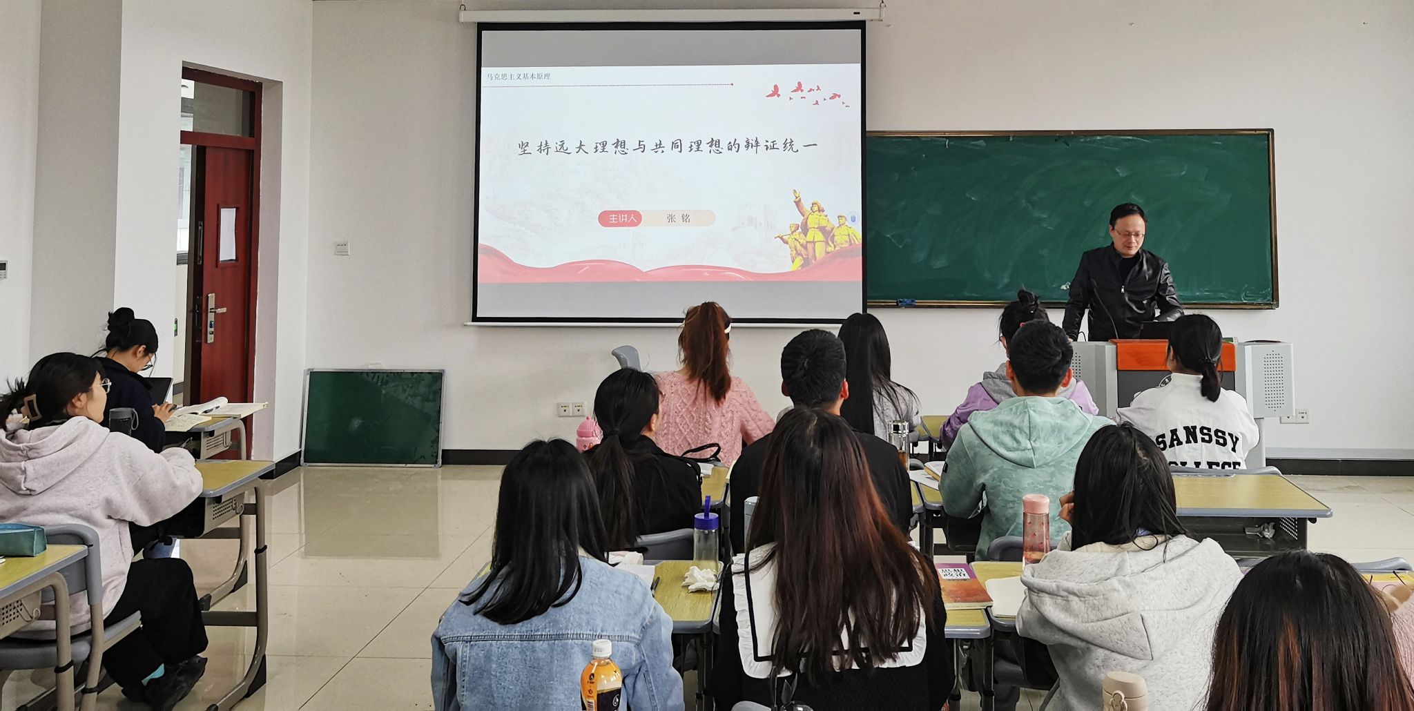 张铭主讲的题目是“坚持远大理想与共同理想的辩证统一”。他认为,思政课教学应当以“八个统一”为指导思想,要有问题意识,切实落实思政课根本任务。结合主题,他从“为什么要坚持共产主义远大理想”“为什么要坚持中国特色社会主义共同理想”“怎样认识和把握远大理想和共同理想的辩证关系”这三个方面展开教学。