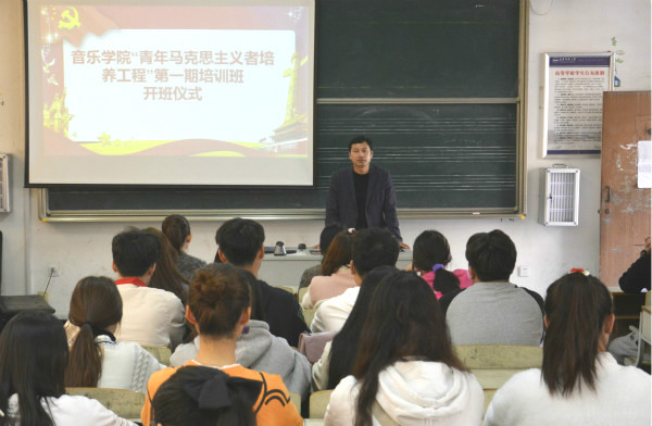 11月6日,音乐学院第一期“青马工程”培训班开班仪式及开班第一课在艺术楼B105举行,音乐学院党委副书记肖之进出席培训班开班仪式,学生会全体成员,2019级和2020级班长、团支书、学习委员等40余人参加学习培训。开班仪式在雄壮的国歌声中拉开序幕。