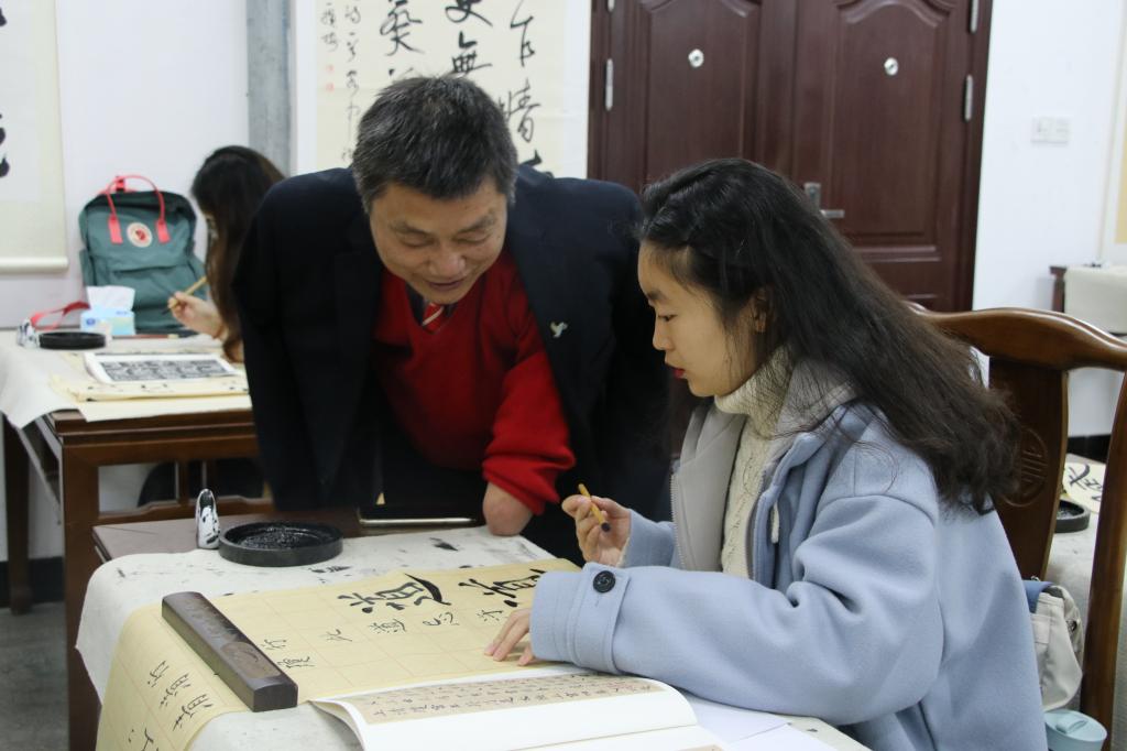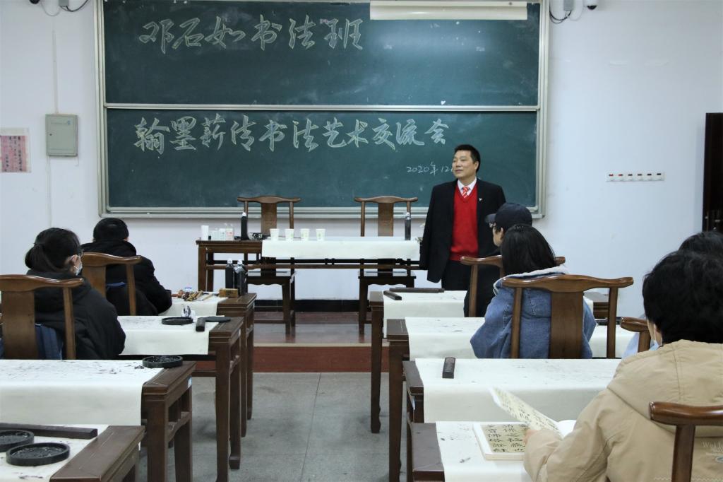 12月2日,校园艺术文化节系列活动之“翰墨薪传”书法艺术交流会在文津楼101教室举行。全国自强模范、中国书法家协会会员赵靖,邓石如书法班指导老师熊言安及学员代表参加交流。