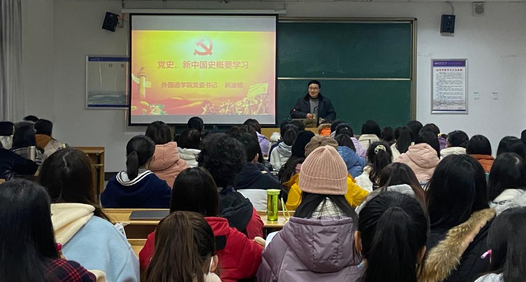 12月10日,外国语学院在E201教室开展“学四史”专题党课。外国语学院党委书记郝涂根讲授了题为“党史、新中国史学习概要”的专题党课。学院党支部书记、辅导员、第62期全体入党积极分子参加了党课学习。