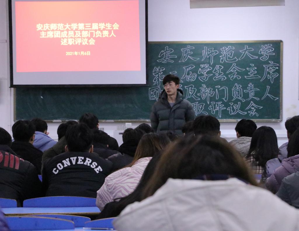 1月6日,第三届学生会举行2020至2021学年第一学期述职评议会。校团委相关老师、校学委会全体委员、各学院学生代表等60余人参加会议。