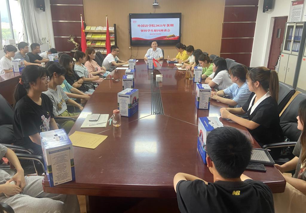 近日,外国语学院召开暑期留校考研学生慰问会。学院党委副书记夏斐、学工组全体辅导员以及2018级留校考研学生参加了慰问会。