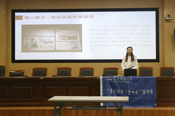 “大家知道首开国共两党地方合作抗日先河的‘岳西谈判’吗?”黄薛杰从岳西谈判讲起,向场下学生抛出问题。随后,她还从作战策略、战略意义等方面介绍了平坦伏击战、范家岗伏击战、棋盘岭伏击战、铁铺岭伏击战等安庆土地上发生的各类伏击战。