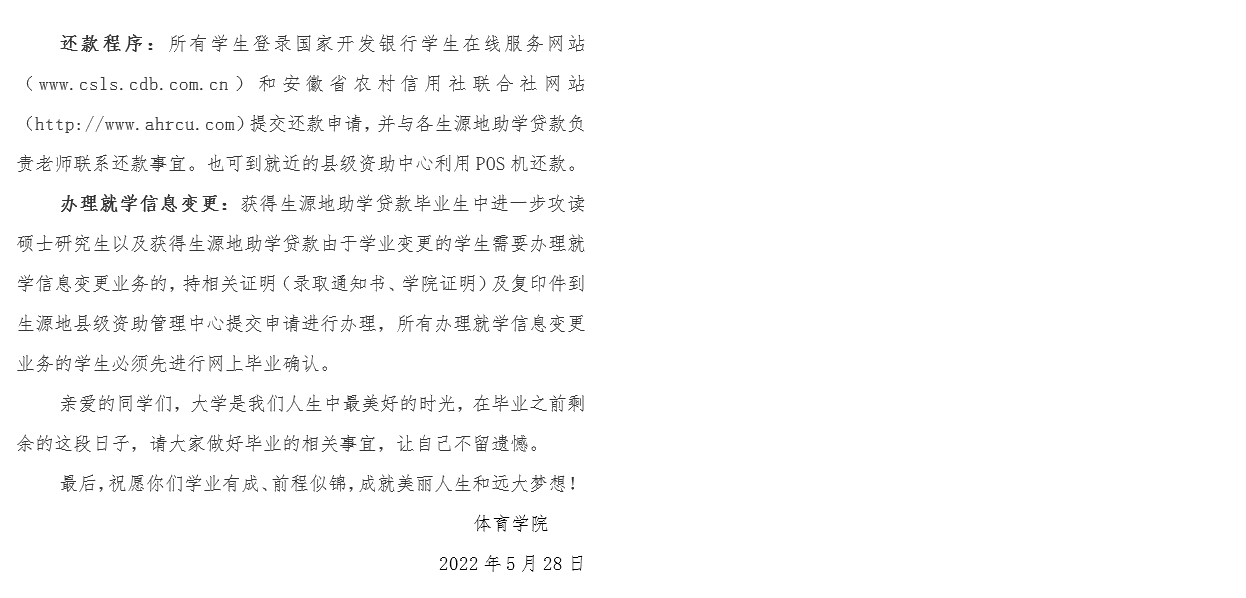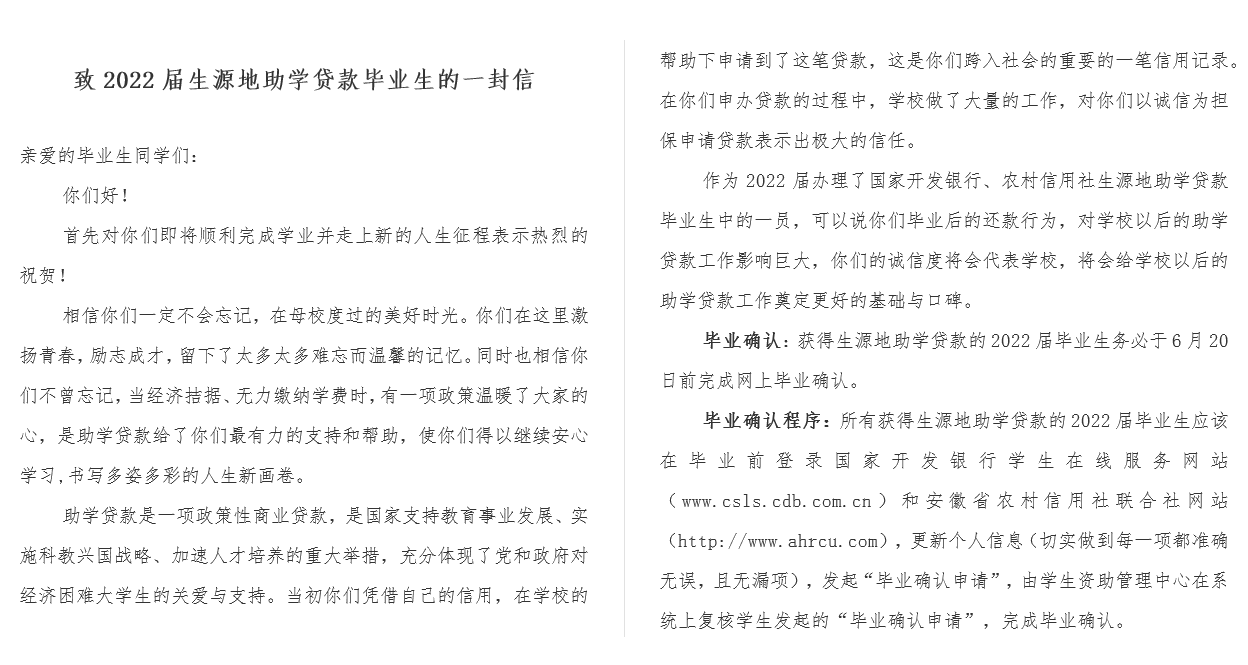 为保证生源地信用助学贷款持续健康的发展,学院组织了2022年毕业学生贷款确认工作。学院将《致2022届生源地助学贷款毕业生的一封信》转发给毕业生,确保每一位同学都收到相关消息。生源地信用助学贷款学生毕业确认工作,有助于确保生源地贷款的按时回收,加强学生对国家助学贷款及其他资助政策的了解,培养学生们守信做人、心怀感恩、勇担责任的意识。
