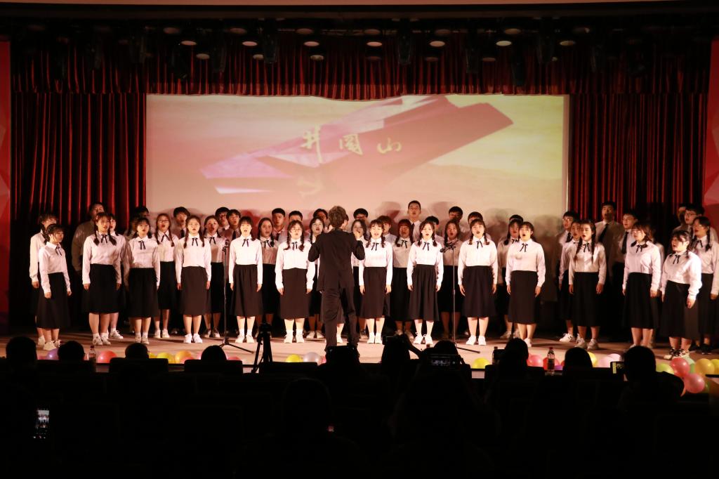 人文学院合唱团表演的合唱曲《不忘初心》庄严高雅、曲调悠扬,讲述了中国共产党的百年历程,赞扬了党不忘初心、砥砺前行,带领中国人民创造更加幸福美好生活。