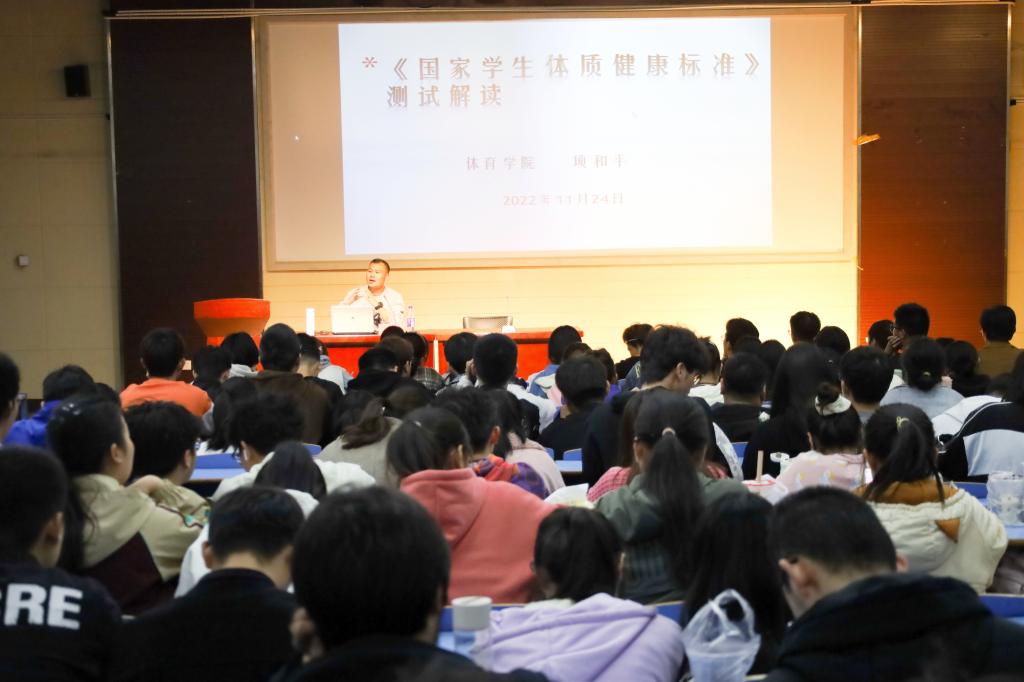 11月24日,数理学院邀请校体测中心负责教师项和平开展《国家学生体质健康标准》测试解读专题讲座,全体辅导员老师和240余名学生代表到场聆听,党委副书记彭芳珍主持讲座。