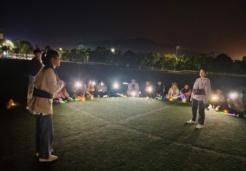 舞蹈串烧、吉他弹唱、自由展示……11月15日,在南门操场上,41名同学手持荧光棒,围坐在摆满灯光的圆圈里举办着一场有声有色的荧光晚会,这是国际贸易专业2021(1)班的学生开展以“你好,新同学”为主题的心理健康活动。“大家才认识两个月,肯定有很多不了解彼此的地方,希望通过这个荧光晚会能够给大家一个展示以及相互认识的机会。”负责人凌雪儿同学介绍。