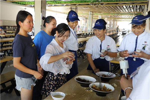 热火朝天的场面引得食堂的阿姨前来围观。“阿姨,来尝尝我们做的月饼。”广播电视学2017(2)班的胡雅丽抱着已经包装好的月饼递给围观的阿姨,“阿姨,你们辛苦了,中秋节快乐。”“谢谢宝贝们呀,也祝你们中秋节快乐。”李阿姨家就住在学校附近,但为了准时为没回家的学生准备好晚餐,便要留在食堂等到关门才能和家人团聚。“因为阿姨们平时也挺累的,有的家住得远,中秋节也不能和家人团聚,所以我们就想着给他们也送一点,一点小心意来感谢他们为我们所做的一切。”胡雅丽说,她负责这次活动的准备工作,模具、馅料、一次性手套等都是她采购的,为食堂阿姨送上月饼也是她的主意。
