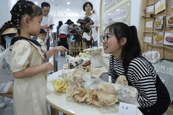 在食用菌科普展区,孩子们被形形色色的菌类吸引了脚步。有形似石头的茯苓,油亮舒展的灵芝,还有小黄帽一般精巧可爱的榆黄菇……“蘑菇原来有这么多种类呀!”一位正在参观的小朋友发出惊叹。还有摆满各色昆虫标本的昆虫科普展区,让小朋友们在幼儿园里就能亲近自然,感受生命的奇妙。