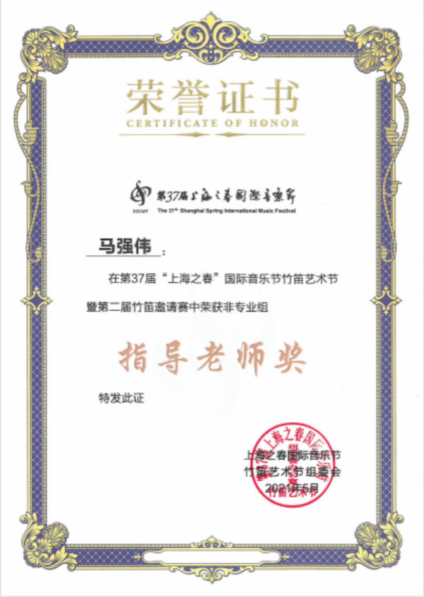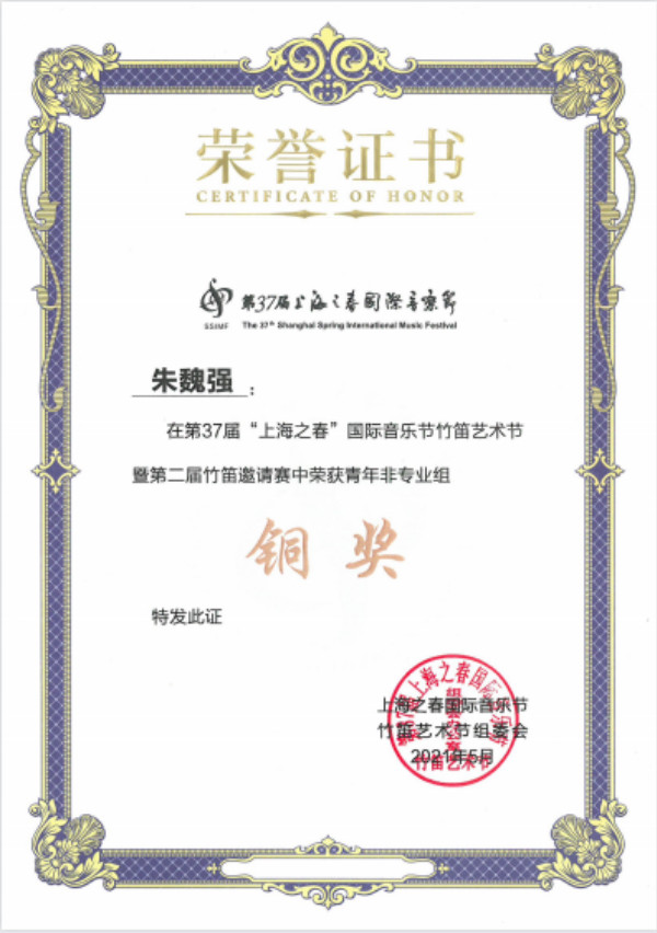 近日,第37届“上海之春”国际音乐节竹笛艺术节暨第二届竹笛邀请赛获奖名单公布,威尼斯官网音乐学院音乐学专业2017级(2)班学生朱魏强获全国铜奖,教师马强伟获指导老师奖。