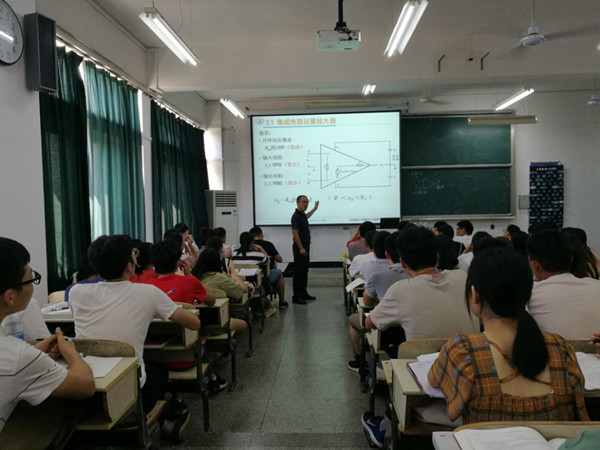课上,丁晓贵首先复习了上次课的内容,加深学生对知识点的印象。接着,他用几个问题引出了所要学习的新内容,耐心讲解,及时提问,用幽默风趣的语言将复杂难懂的电路图知识变得有趣起来。通过丁老师扎实的专业技能和良好的教学方式,同学们不仅得到了技能上的提高,更对模拟电子技术这门学科产生更多的热情和学习积极性。