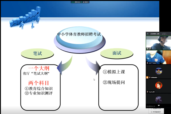 为进一步做好党史学习教育,把“我为群众办实事”落到实处,6月2日,体育学院通过线上举行2021届毕业生教师招考培训会,给参加2021年各级教师招考的同学提供精准的笔试和面试指导,帮助学生们更好地进行职业发展规划,从而积极推动体育学院2021届毕业生高质量就业。本次讲座邀请了原安庆市第九中学副校长、现任北京市陈经纶中学体卫艺处负责人、正高级教师王琦主讲,体育学院院长章翔教授也为同学们做了教师招考培面试环节的专题培训,体育学院党政领导、毕业班辅导员老师以及2021届毕业生、其他年级学生参加本次线上培训会。