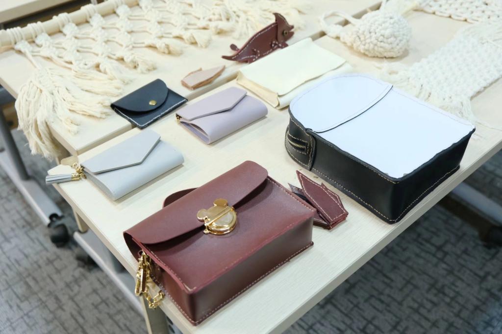 斜挎包、手提包、马鞍包、手工编织挂饰、荷花缠花、梅花缠花……每个班级的作品一一陈列展出,同时选出代表对作品进行介绍。对于学员介绍的作品,汤小曼逐一进行分析指导,“皮具颜色很好,但是形式过于单一,思想不够跳脱,款式方面可以有更多的创新。”