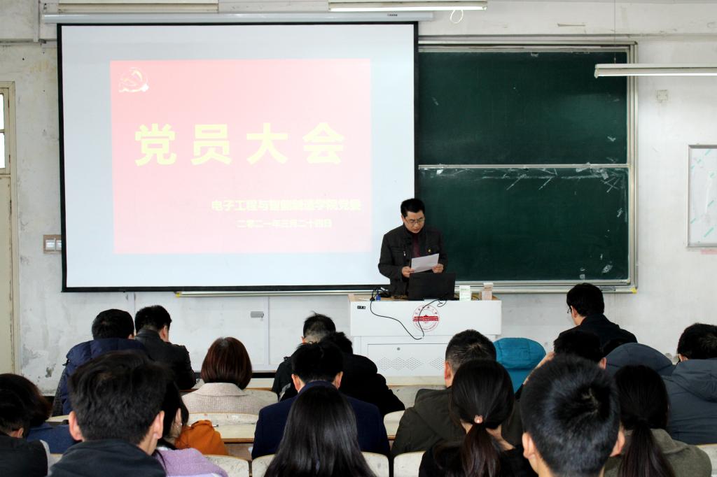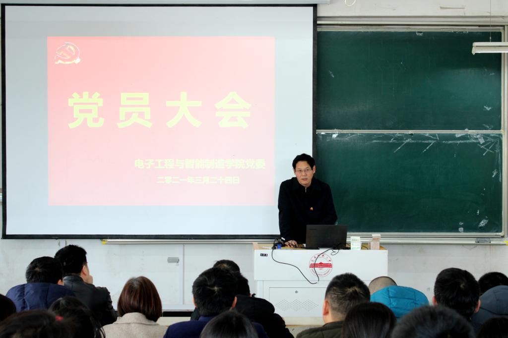 3月24日下午,电子工程与智能制造学院党委在稼先楼二楼多媒体教室召开全体党员大会,深入学习贯彻习近平总书记在党史学习教育动员大会上的重要讲话精神,传达学习省委和校党委党史学习教育暨新一轮深化“三个以案”警示教育动员部署会议精神,对学院党史学习教育暨开展新一轮深化“三个以案”警示教育进行部署安排。学院党委书记江贵生作动员讲话,会议由学院党委副书记关德军主持。