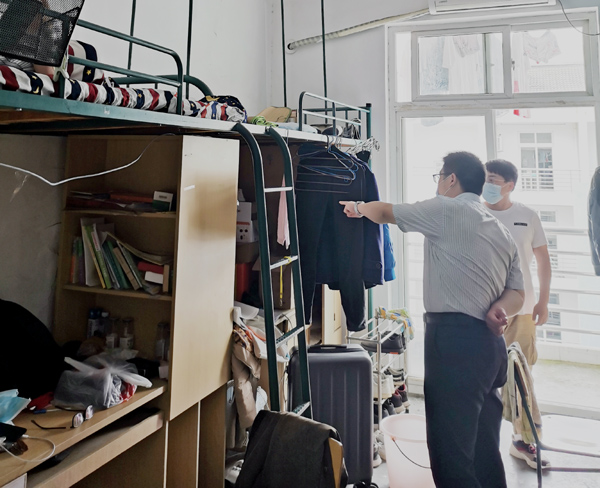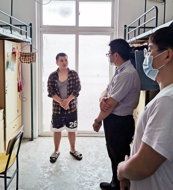 学生返校前后,学院负责同志深入到学生宿舍中去,实时了解和掌握返校同学的身体状况、思想状况和心理状况,勉励他们要珍惜时光,安心学习。嘱咐同学们要做好自我防护,注意身体健康和安全,确保疫情防控扎实有效。(数理学院)