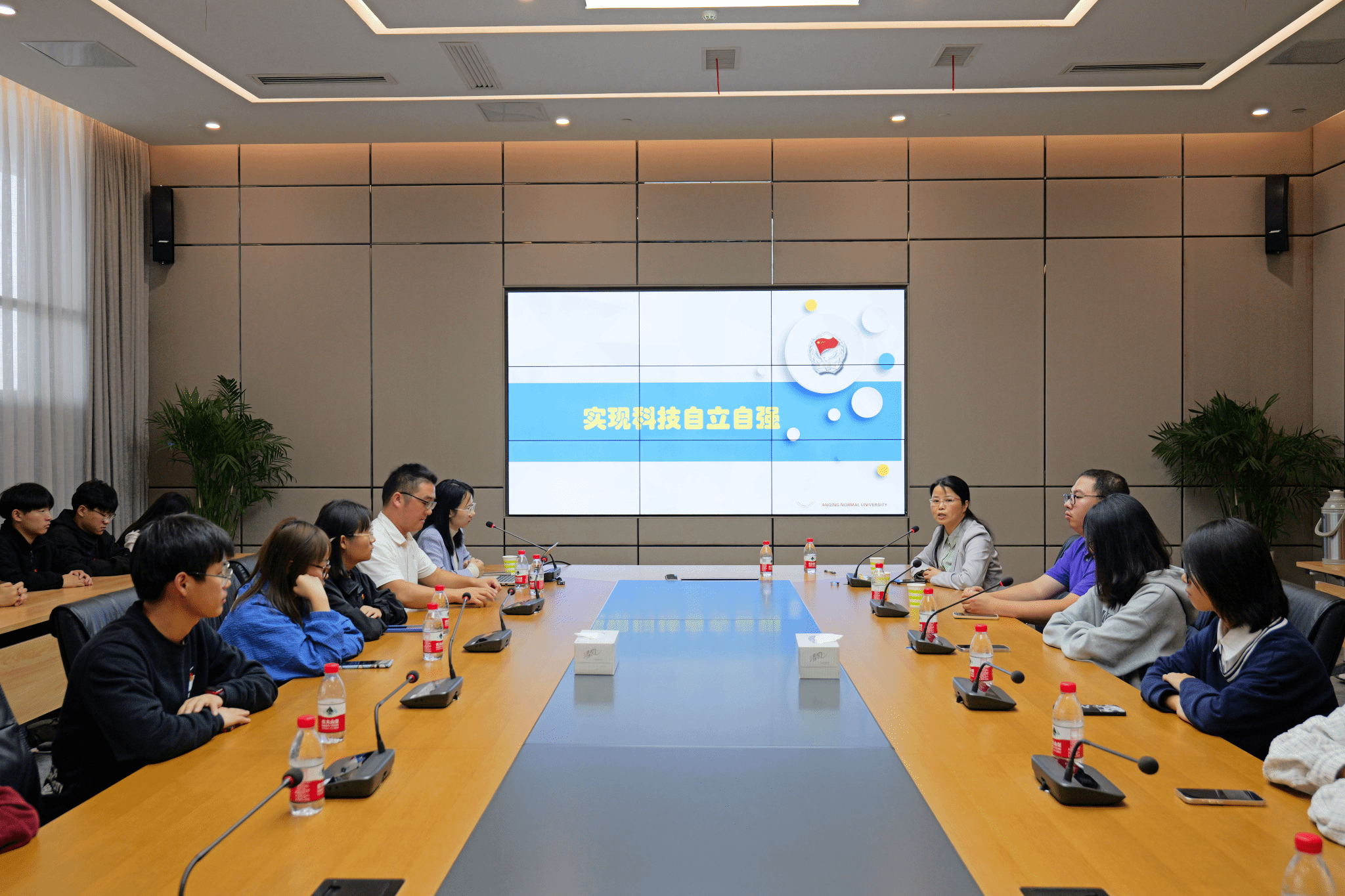 现场教学结束后,领学教师徐雯钰在会议室以《科技自立自强》为题,为参与活动的全体师生上了一堂“行走的”思政课。从“什么是科技自立自强”“为什么要科技自立自强”“作为青年学子应该怎么做”三个方面,结合时政热点进行了详细举例分析。就“为什么要科技自立自强”方面,徐雯钰从理论逻辑、历史逻辑、现实逻辑、发展逻辑、时代逻辑五个方面阐述了科技自立自强的原因,并希望广大青年学生要做“创新者”,积极参与创新实践活动;要做“宣传者”,弘扬科学家精神;要做“守护者”,自觉维护科技安全。“专业不是限制,而是一个平台,要打破思维定势,致力于改革创新。”徐雯钰鼓励学生们,作为未来思想政治教育工作者,要充分发挥思想政治教育的力量,切实扛起为党育人、为国育才的政治责任。