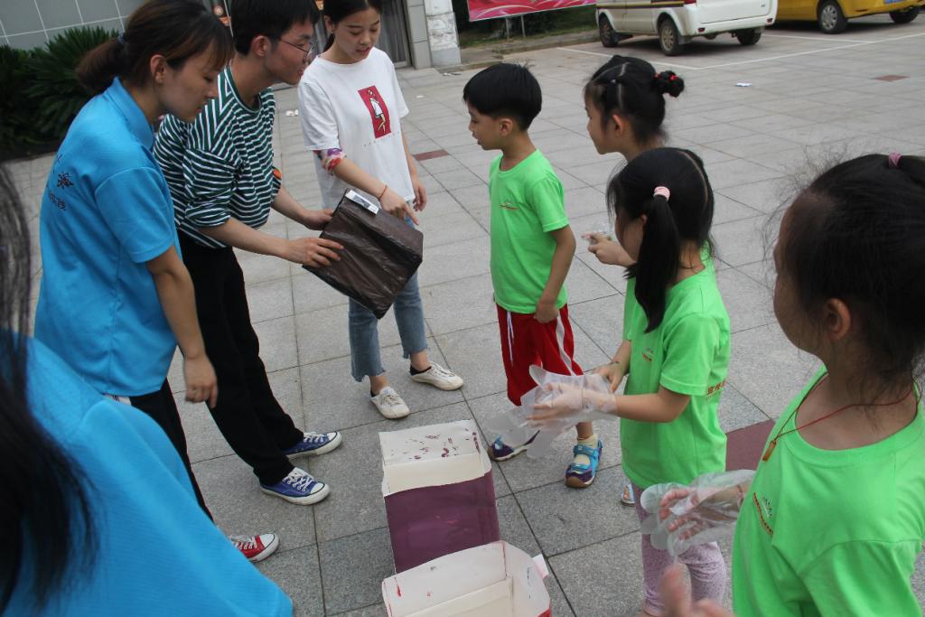 看着这些孩子们迫不及待的表情。支教老师王盼归说:“塑料有很多种,但不一定全是可回收垃圾哦,废料桶可能有残留的有毒废料,对环境和人体还有动物都可能造成伤害。”在解答完孩子们的疑惑后,支教老师带领学生到附近广场进行了垃圾寻宝游戏。