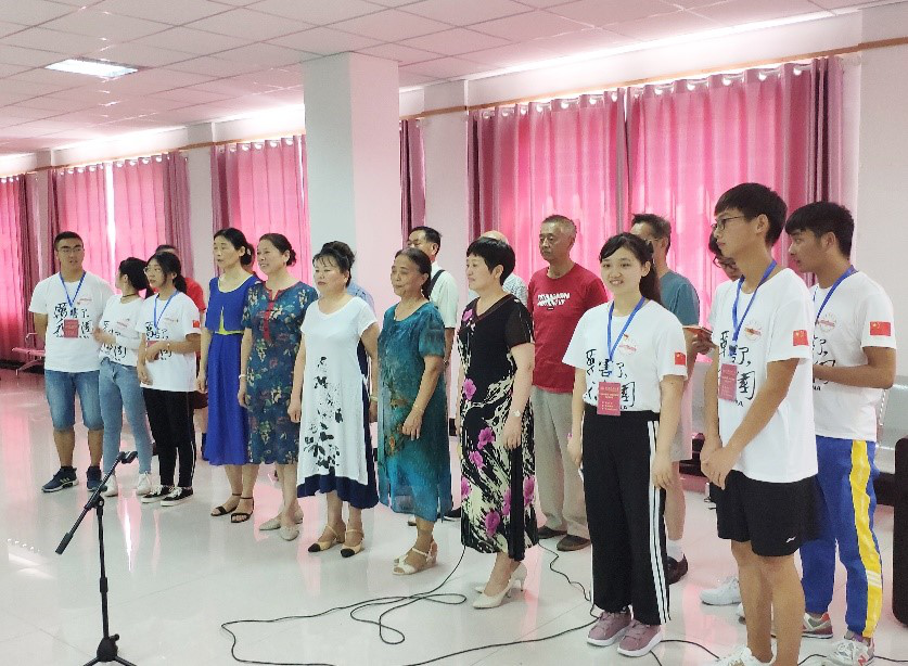 在团队成员们的提议下,团队成员们与红色文艺班的老师们合唱了《八月桂花遍地开》。现场气氛一再高涨,“八月桂花遍地开,鲜红的旗帜迎风摆,敲锣又打鼓啊……”在场的团队成员们在老师们的带领下,深深地被这首歌打动。陈晓讷同学说:“真的!当我听见身边那位老爷爷唱第一句的时候,我真的很激动,因为他的声音真的太浓厚了,我真的感觉他唱出了这首歌的力量了!”合唱之后,团队成员们为表示感谢,合唱了《没有共产党就没有新中国》、《我和我的祖国》。