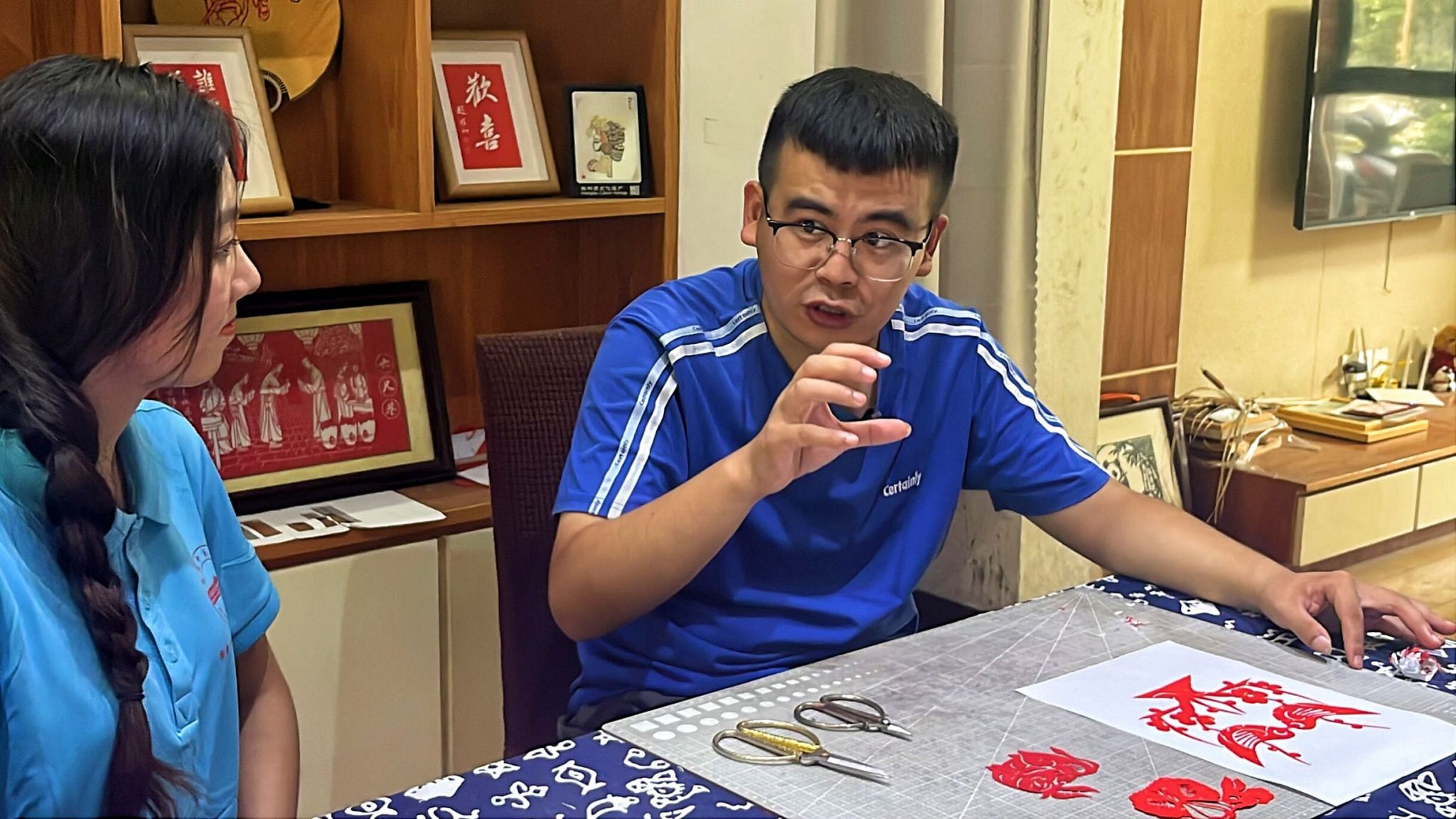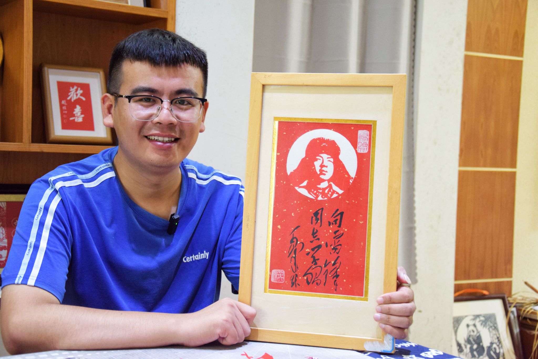 一张张普通的宣纸嬗变为一幅幅栩栩如生的作品,情韵和细腻在纸上倾泻流露。近日,“青·传承”宜城“遗”故事——寻访宜城“守艺人”暑期三下乡实践团走进95后剪纸匠人曹英杰工作室,了解剪纸文化、学习传统技艺。