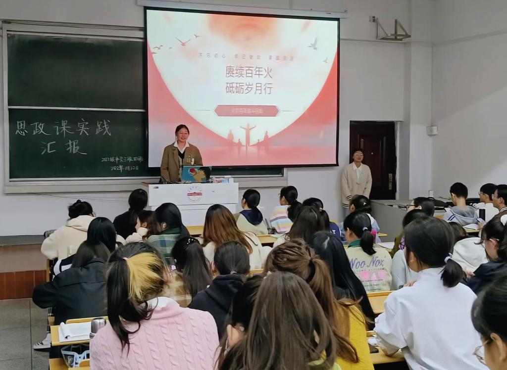 实践教学的前两周,同学们在老师的指导下,在各思政小组组长的主持下,深入学习党的二十大报告的主要内容并进行小组专题研讨,制作汇报课件。实践教学的第三周,各教学班级举行了实践教学成果汇报分享活动。“领悟伟大建党精神”“践行绿色发展理念”“实现中国梦,青春正当时”“创新与传统齐飞,文化共时代一色”“砥砺奋进二十大,不负时代写芳华”……各组的汇报内容具体深刻,汇报形式丰富多样,美观清晰的课件、联系实际的案例、生动形象的视频、激情飞扬的分享,总是迎来一阵阵掌声,同学们在热烈的课堂气氛中跟随汇报人多方面全方位地深入学习了党的二十大精神。2022级中文四班的王婧同学分享道:“这次的实践教学,充分发挥了我们的主动性,增强了我们的学习兴趣,在小组研讨、大班分享中,我对党的二十大精神的认识不断深化和提高。”
