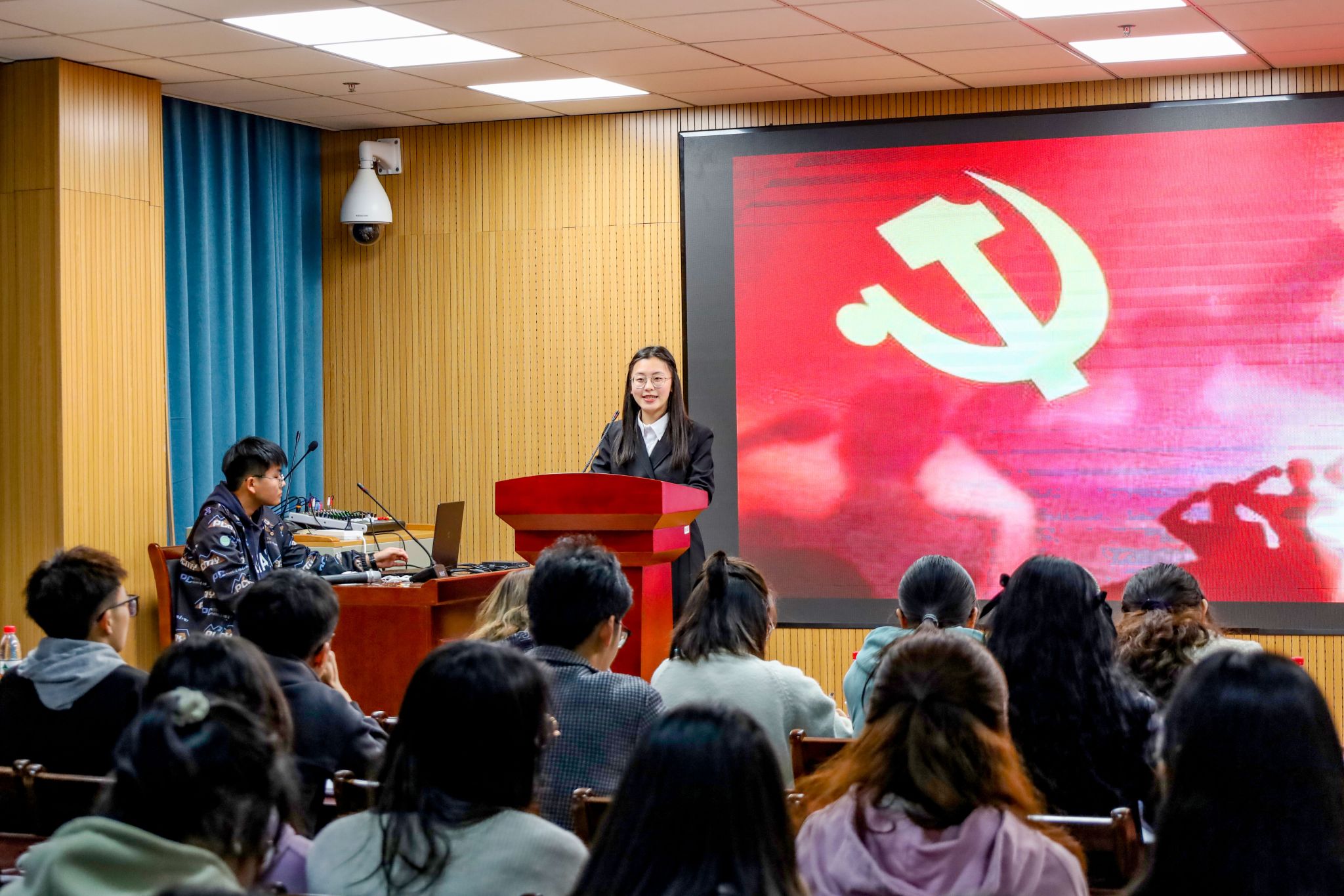 “大家认为现在的时代是什么样的?”在演讲正式开始前,法学类专业2022(2)班的张文君向在场观众抛出了一个问题。伴随着舒缓的背景音乐,她列举了百年发展时光中的今昔对比,讲述了从九零后到零零后,无数青年人挑起社会的大梁。“少年应有鸿鹄志,当骑骏马踏平川。”她号召同学们勇做“后浪”,立足于当下最好的时代,主动肩负起“强国一代”的历史责任和“强国有我”的时代使命。