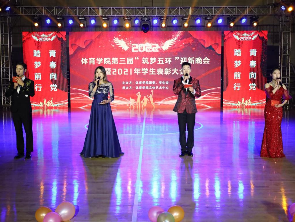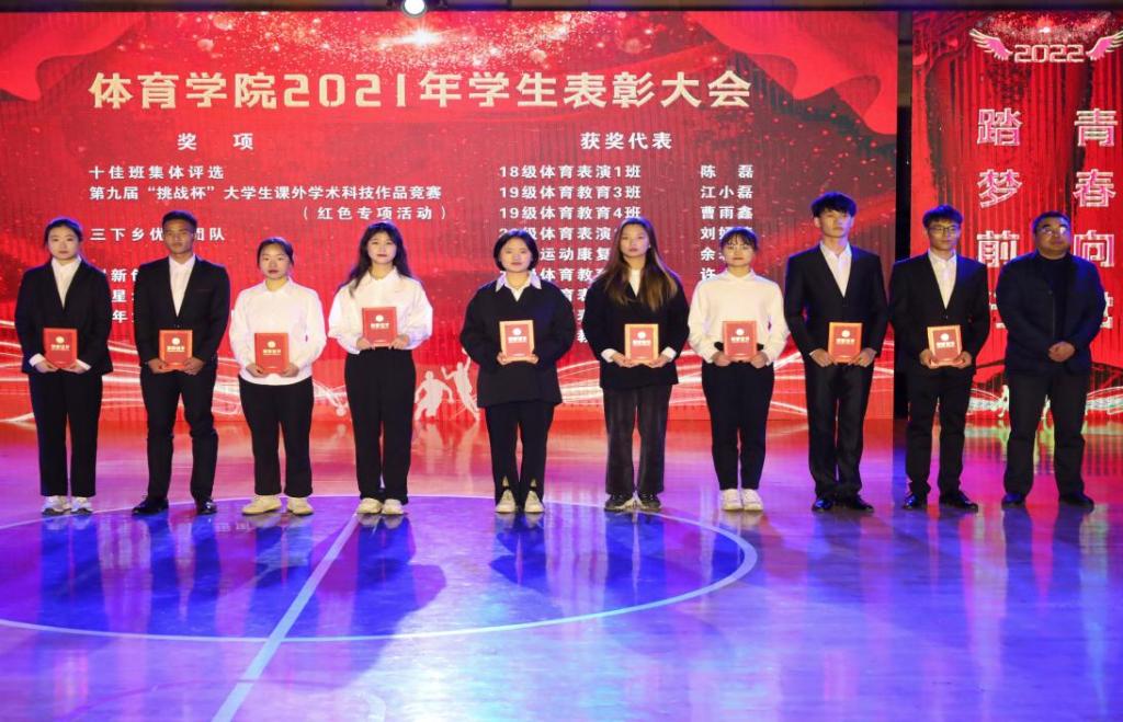 在表彰环节,王开友和章翔分别为18位获奖代表颁发了各类获奖证书,包含国家奖学金、国家励志奖学金和各类专业类赛事奖项。“举办此次晚会,是对2021年一年来体育学院学子们拼搏进取的成果的一次集体展示。”晚会负责人体育教育专业2019(3)班的雷君杰表示,希望学生们能够通过本场晚会对今后的专业内容与专业知识有一个更全面、更立体的认识与理解,不断扎实基本功底、提升专业技能。(撰稿:学生记者 权琪 摄影:学生记者 吴浪 审核:高栋梁)