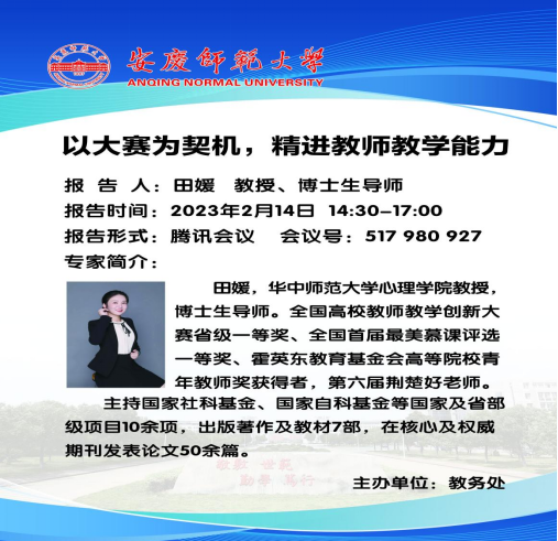 近日,威尼斯官网特邀荣获全国高校教师教学创新大赛国赛教授组二等奖、全国首届最美慕课一等奖获得者,华中师范大学教授、博士生导师田媛开设线上主题讲座。教务处负责同志主持本次讲座。