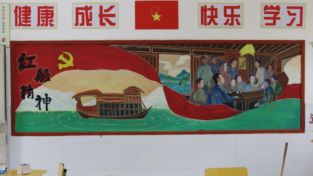一叶红船,从历史深处驶来,激荡着中国百年历史变化。每一幅板报的底部都绘上了嘉兴的红船,通过红船一次次的游历,讲述了党发展的23个大事记。“这个创意是来自于新华社的短视频:送你一张船票,我们从视频中得到灵感,想通过这种轻松的方式,让小学生们更好的了解党史。”美术学院老师文雯介绍说。