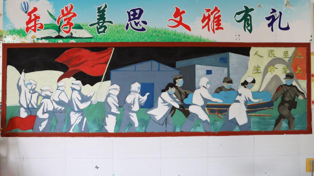 六年级(1)班绘制的板报主题是《生命至上 中国抗击新冠疫情斗争取得重大成果》,一群身穿厚重防护服的医护工作者们穿梭于救死扶伤的一线,前方的医护人员救助病人,后面的医生们举起了一面鲜艳的国旗,为前方的战友加油助威。“疫情是我们每个人亲身经历了的,感受真的很深。”作品的创作者之一汪璇璇说,疫情期间一直居家,自己每天都会关注新闻,当看到更多的人战胜病魔,武汉春暖花开时,自己会特别感动。“这场疫情里,白衣天使们做出了巨大的贡献,尤其是党员们更是冲在第一线,这是一段难忘的、需要永远铭记的党史。”她表示,自己是主动要求创作这个主题的,“我想让更多的人了解它,记住它。”