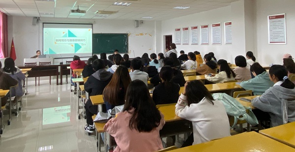 施玮玮从什么是新闻,如何写出好新闻及写作中容易出现的问题三个方面与同学们展开探讨。他指出,好新闻要有灵魂,有温度。写作者要做到铁肩担道义,妙手著文章,用事实说话的同时不失人文关怀。他强调,新闻写作要会选题、会采访、会结构。施玮玮结合自己多年工作经验,以风趣幽默的语言,多角度、深层次地为同学们讲解了新闻写作与摄影剪辑的逻辑和写作技巧。