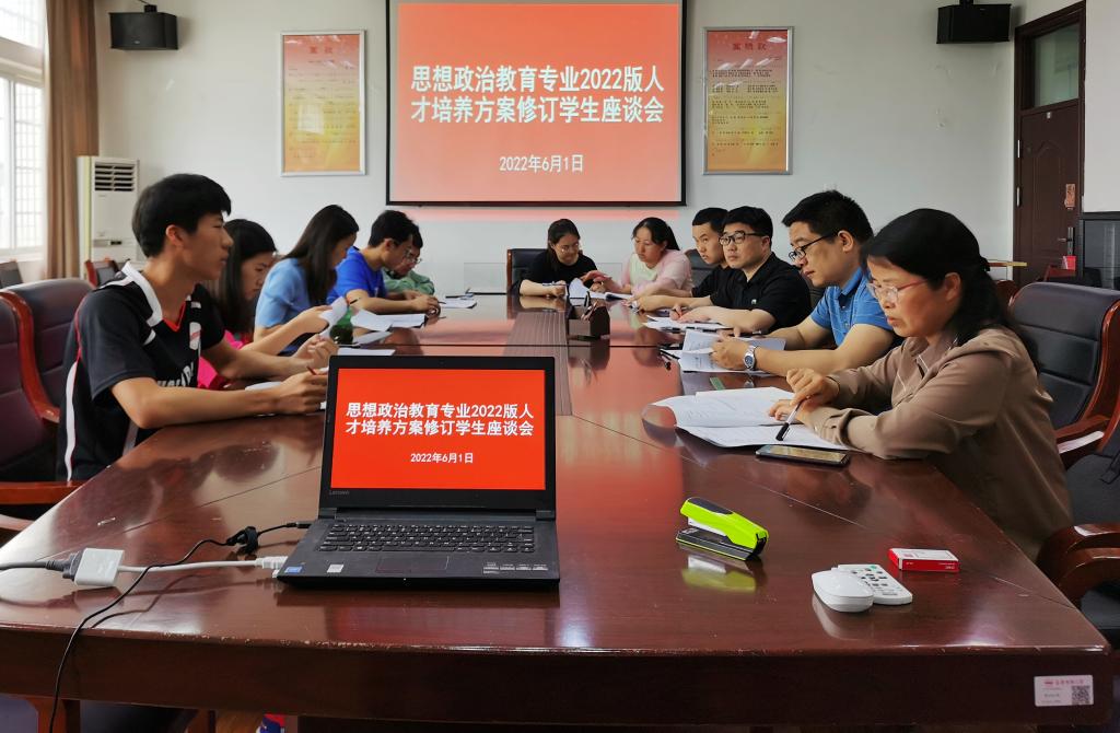 思政专业负责人严仍昱教授对人才培养方案的修订原因和内容进行了说明。8名毕业班学生代表对培养方案中的课程设置、修课学期、实践教学、教育实习、学分选修等内容提出了自己的意见。教师们重点对培养目标进行了讨论。