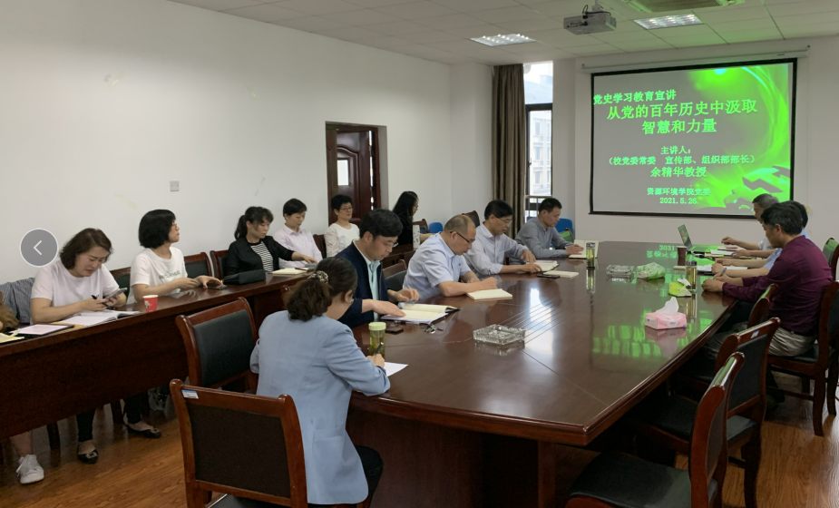 为全面贯彻校党委关于开展党史学习教育的安排部署,进一步推进党史学习教育走深走实,5月26日,资源环境学院党委举办党史学习教育宣讲会,邀请校党委常委、宣传部长、组织部长余精华教授为学院全体教工党员作了一场“从党的百年历史中汲取智慧和力量”宣讲报告,学院班子全体成员、全体教职工党员共同聆听了本场报告,学院党委书记夏宏宇主持报告会。
