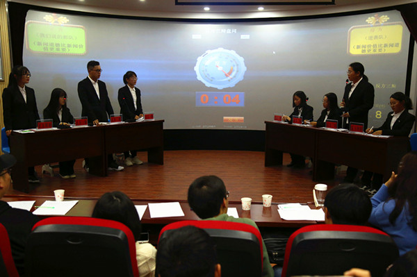 比赛进行到第二轮,地理科学二班与旅游管理二班队伍就“新闻价值和新闻道德谁更重要”的辩题展开辩驳。“2006年刘为强藏羚羊照片造假事件,白冰冰女儿绑架案事件,正是这些新闻工作者将新闻价值凌驾于新闻道德之上才会导致诸如此类的事件恶化。”正方队伍不断举例子、摆数据,使用犀利言辞对反方队伍步步紧逼。十位辩论队主力强强对话,为观众奉献一场旗鼓相当的对决。