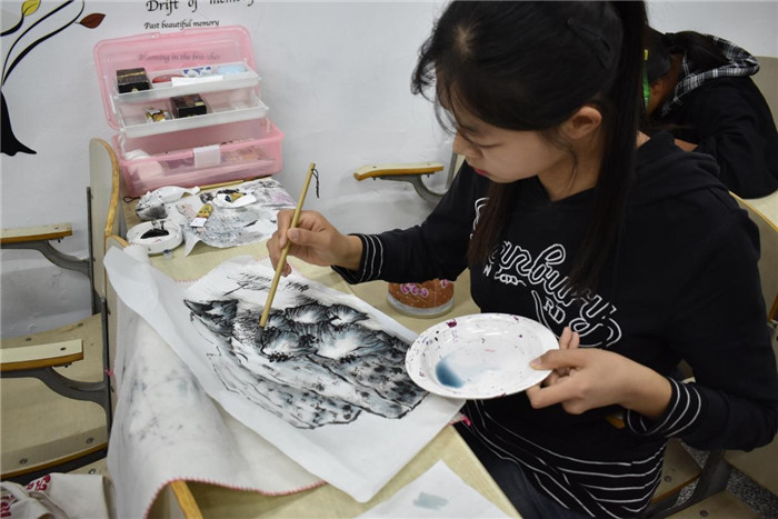 “我这副作品叫《临江仙》,画的是山石,灵感来自于曾经看过的一幅画以及辛弃疾的一首词《临江仙》,我想要营造出金沙拍浪的壮阔意境。”学前教育专业2020(2)班的郭玉洁说,她曾经学过两年国画,一直非常喜欢有汉元素的事物。