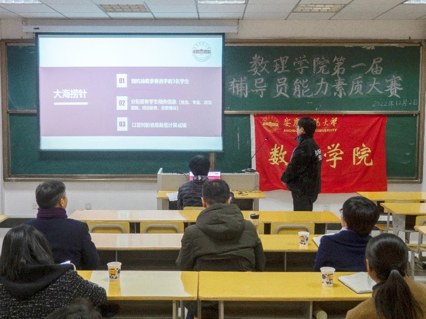 12月2日,数理学院在I楼204教室举办第一届辅导员能力素质大赛,加强学院辅导员队伍专业化职业化建设,全方位提升学院辅导员的理论水平、专业素养和工作能力。学院党委书记陆健、院长申传胜、党委副书记彭芳珍受邀担任评委,学院全体专职辅导员参加比赛。