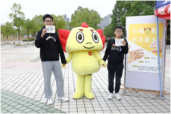 “吉祥物太可爱啦!”“我可以和小角合照吗?”“和小角互动真的很解压!”……在活动现场,身着玩偶衣的吉祥物“小角”与学生们挥手、拥抱,热情的动作和憨态可掬的体态吸引大家纷纷前来“打卡”。百余名学生和小角手拉手、肩并肩,在一片欢声笑语中比“v”合影留念。